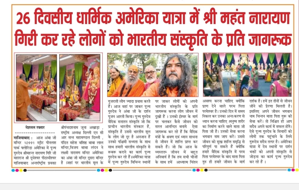 लक्ष्मी नारायण मन्दिर 4615 जार्ज रोड टेम्पा फ्लोरिडा अमेरिका में पूज्य गुरुदेव श्रीमहन्त नारायण गिरि जी महाराज श्री दूधेश्वर पीठाधीश्वर गाजियाबाद अन्तर्राष्ट्रीय प्रवक्ता श्रीपंचदशनाम जूना अखाड़ा राष्ट्रीय अध्यक्ष दिल्ली एन सी आर सन्त महामण्डल दिल्ली के अध्यक्षता सानिध्य में लक्ष्मी नारायण मन्दिर के स्वामी जी महर्षि ओम जी महाराज , पंडित महेश वशिष्ठ जी बाबा लाल मन्दिर गाजियाबाद,विजय बाबा जी लंडन यू के , उपस्थिति में अमेरिका में निवास कर रहे भारतीय मूल के लोगों ने शनिदेव की पूजा वट वृक्ष की पूजा किया ,