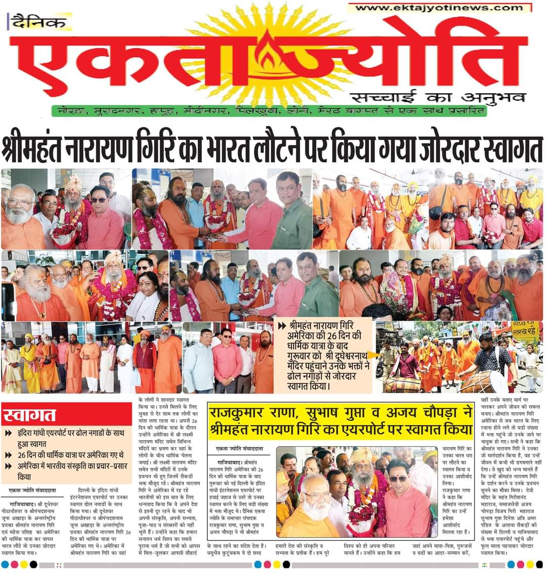 भगवान दूधेश्वर की सेवा में उपस्थित होंगे साथ ही पूज्य गुरुदेव श्रीमहन्त नारायण गिरि जी महाराज के दिल्ली एन सी आर सन्त महामण्डल दिल्ली के अध्यक्ष बनने पर धार्मिक यात्रा पूर्ण करके आने पर दिल्ली हावाई अड्डे पर दिल्ली सन्त महामण्डल के सन्तों द्वारा प्रातः काल 9 बजे स्वागत किया ,साथ ही भगवान दूधेश्वर के भक्त पूज्य गुरुदेव के शिष्य गण सभी ने भव्य रूप से पुष्प माल्यार्पण कर स्वागत किया .