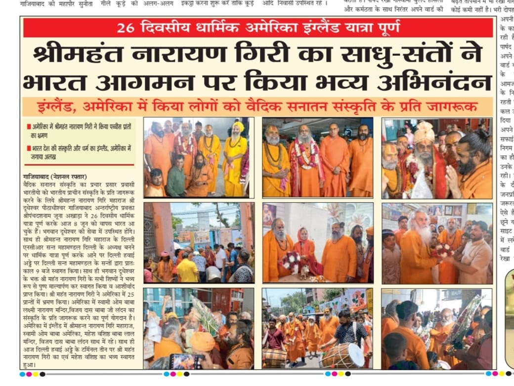 वैदिक सनातन संस्कृति का प्रचार प्रसार प्रवासी भारतीयो को भारतीय प्राचीन संस्कृति के प्रति जागरूक करने के लिये पूज्य गुरुदेव श्रीमहन्त नारायण गिरि जी महाराज श्री दूधेश्वर पीठाधीश्वर गाजियाबाद अन्तर्राष्ट्रीय प्रवक्ता श्रीपंचदशनाम जूना अखाड़ा ने 26 दिवसीय धार्मिक यात्रा पूर्ण करके आज 8 जून को वापस भारत आ चुके हैं.