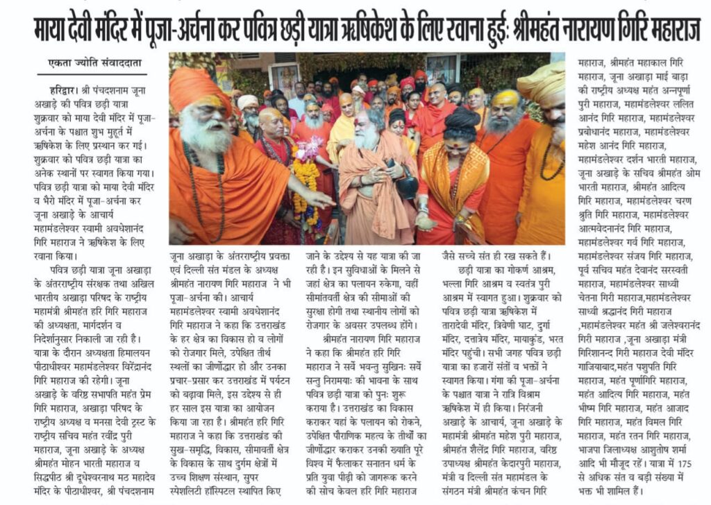 आचार्य महामंडलेश्वर स्वामी अवधेशानंद गिरि महाराज ने माया देवी मंदिर व भैरो मंदिर में पूजा-अर्चना कर यात्रा को रवाना किया। यात्रा का आयोजन श्रीमहंत हरि गिरि महाराज की अध्यक्षता,मार्गदर्शन व निर्देशानुसार किया जा रहा है।