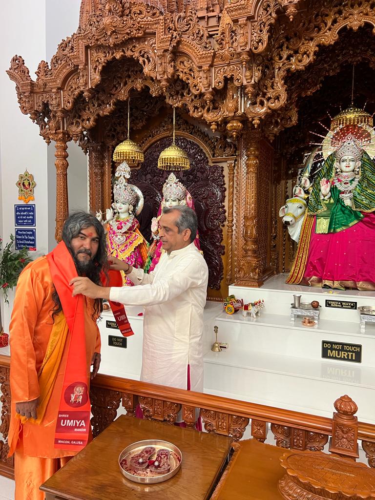 अमेरिका धर्म यात्रा में उमिया माता मंदिर मेकॉन सिटी जॉर्जिया अमेरिकास्मोकी माउंटेन, नॉर्थ कैरोलिना, टेनेसी, अटलांटा अमेरिका में पूज्य गुरुदेव श्रीमहन्त नारायण गिरि जी महाराज श्री दूधेश्वर पीठाधीश्वर गाजियाबाद अन्तर्राष्ट्रीय प्रवक्ता श्रीपंचदशनाम जूना अखाड़ा राष्ट्रीय अध्यक्ष दिल्ली एन सी आर सन्त महामण्डल दिल्ली का उमिया माता मन्दिर ट्रस्ट के द्वारा के अध्यक्ष कांजीभाई पटेल जी , पुजारी सूरजभाई पटेल जी ने पूज्य गुरुदेव का स्वागत सम्मान किया.