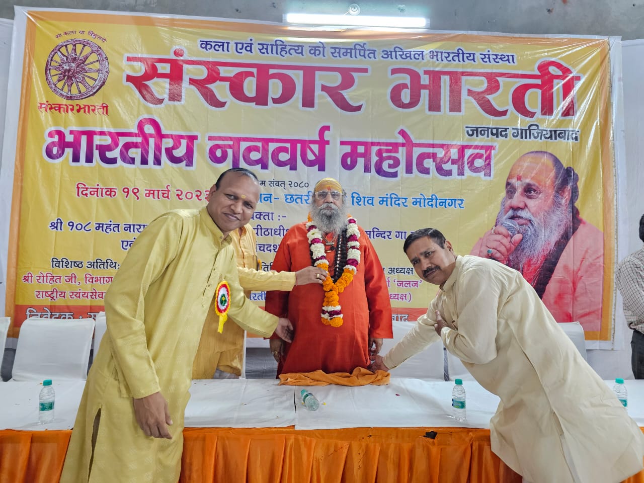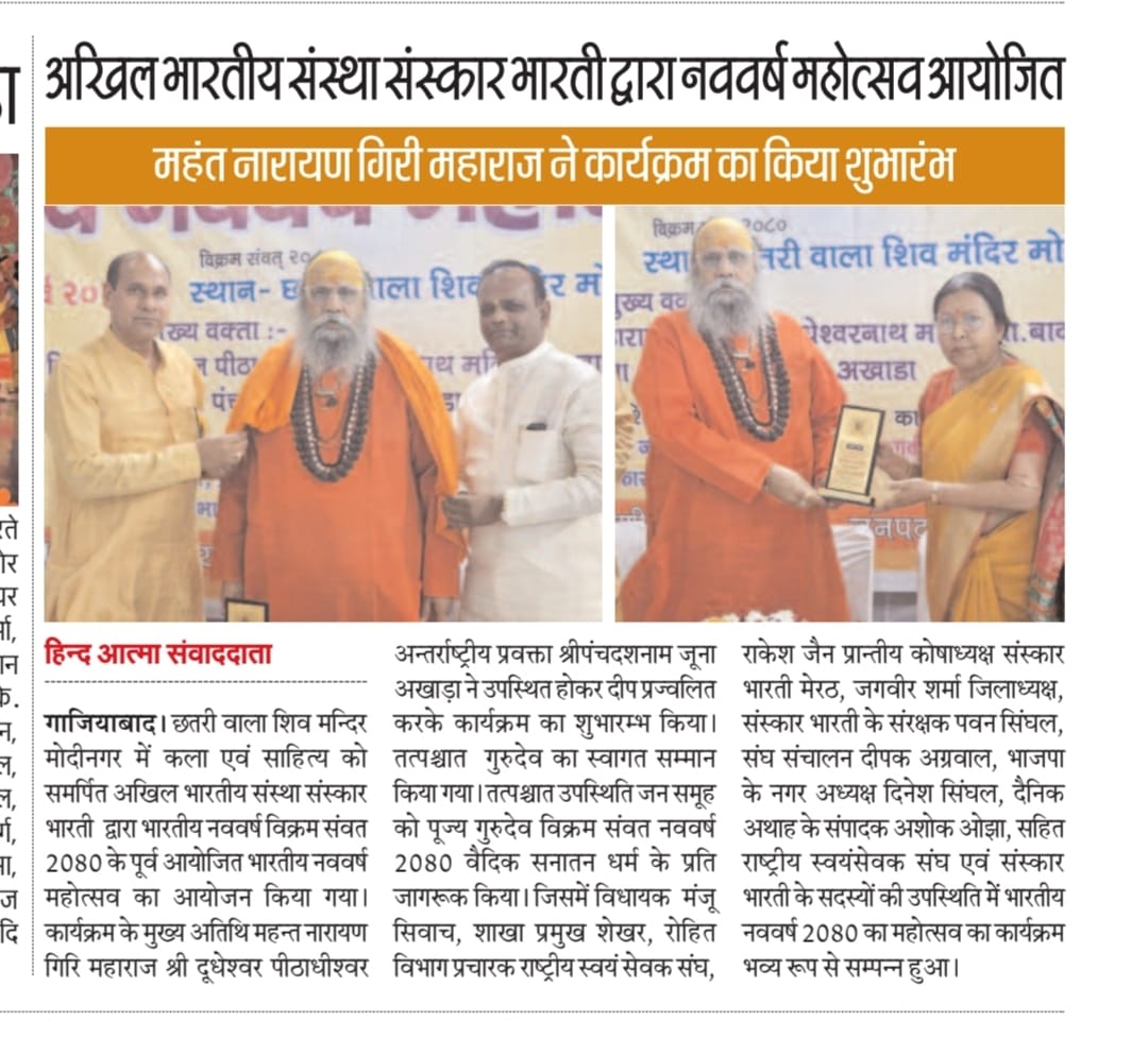 आज छतरी वाला शिव मन्दिर मोदीनगर में कला एवं साहित्य को समर्पित अखिल भारतीय संस्था संस्कार भारती गाजियाबाद के द्वारा भारतीय नववर्ष विक्रम संवत 2080 के पूर्व आयोजित भारतीय नववर्ष महोत्सव का आयोजन किया गया जिसमें मुख्य अतिथि के रूप में पूज्य गुरुदेव श्रीमहन्त नारायण गिरि जी महाराज श्री दूधेश्वर पीठाधीश्वर गाजियाबाद अन्तर्राष्ट्रीय प्रवक्ता श्रीपंचदशनाम जूना अखाड़ा ने उपस्थित होकर दीप प्रज्वलित करके कार्यक्रम का शुभारम्भ किया