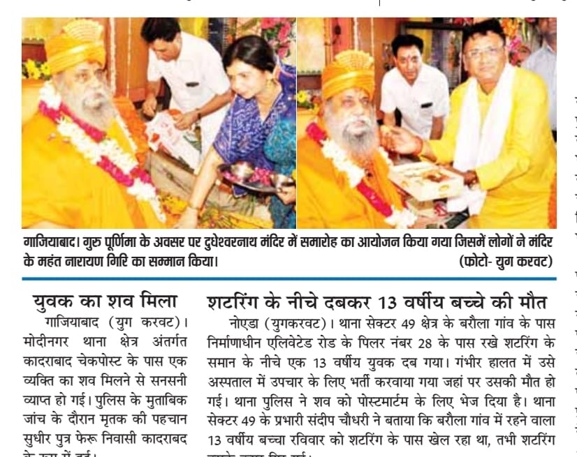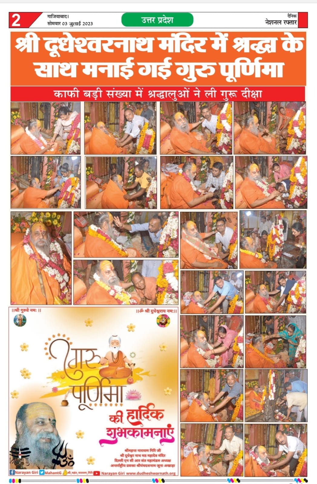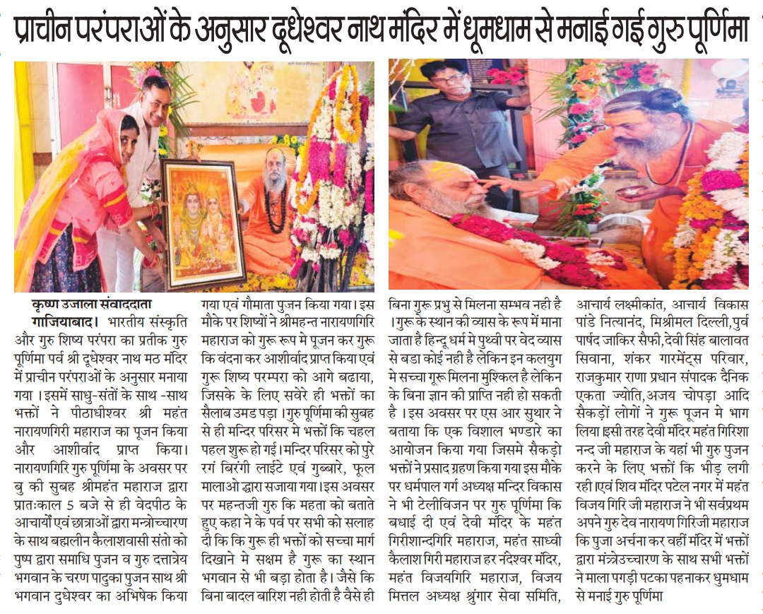 आज गुरू पूर्णिमा व्यास पूजा के पावन.शुभ अवसर.पर सिद्धपीठ श्री दूधेश्वर नाथ.महादेव मठ मन्दिर गाजियाबाद उत्तर प्रदेश मे पूज्य गुरुदेव श्रीमहन्त नारायण गिरि जी महाराज श्री दूधेश्वर पीठाधीश्वर गाजियाबाद अन्तर्राष्ट्रीय प्रवक्ता श्रीपंचदशनाम जूना अखाड़ा राष्ट्रीय अध्यक्ष दिल्ली सन्त महामण्डल ,राष्ट्रीय अध्यक्ष हिन्दू युनाइटेड फ्रंट दिल्ली ने गुरू परम्परा का निर्वाहन करते हुये सबसे प्रथम भगवान दूधेश्वर का अभिषेक पूजन किया ,ब्रह्मलीन सिद्ध समाधी वाले गुरू मुर्तियो का गुरू पूजन किया ,गुरूभगवान दत्तात्रेय जी का पूजन किया ,