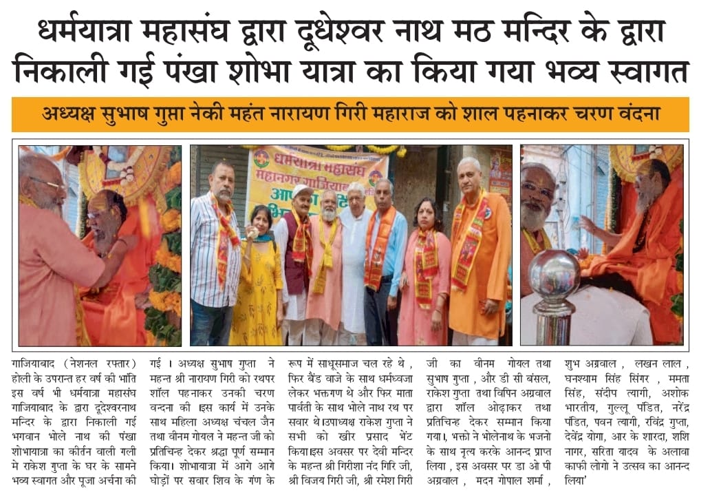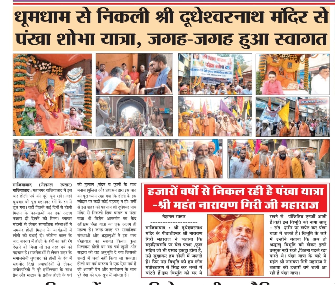8 मार्च को प्रातः काल 9 बजे से 11 बजे श्री दूधेश्वर मन्दिर परिसर में पूज्य गुरुदेव के सानिध्य में देवी मन्दिर के महन्त गिरिशा नन्द गिरि जी एवं सन्तों भक्तों ने नगरशान्ति जन कल्याण हवन यज्ञ हुआ , मध्यान्ह 3 बजे पूज्य गुरुदेव के नेतृत्व एवं अध्यक्षता में दूधेश्वर होली पंखा शोभा यात्रा निकाली गई जिसमें सबसे आगे धर्मध्वजा उसके पीछे नागा सन्त घोडो पे विराजमान होकर दर्शन दे रहे थे उनके साथ ही डी जे दूधेश्वर वेद विद्यालय के छात्र आचार्य,सन्तों का विशाल समूह ध्वजा लेकर चल रहे थे साथ ही बैंड ताशा झांकियां , विशेष रूप से श्री दूधेश्वर रथ में पंखा रखकर पूज्य गुरुदेव विराजमान होकर समस्त नगर वासियों को दर्शन देकर आशीर्वाद दिया.