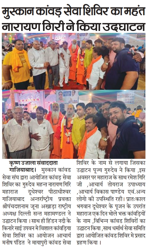 आज श्रावण माह मे कांवडिये.भक्तो के भोजन प्रसाद सेवा विश्राम सेवा चिकित्सा सेवा के लिये न्यूज इंडिया1 के द्वारा कांवडिये भक्तो के लिये शिविर का आयोजन हुआ अनुराग चढ्ढा जी ,यादराम जी ने कावंड़ियों को भोजन प्रसाद प्रारम्भ किया पूज्य गुरुदेव श्रीमहन्त नारायण गिरि जी महाराज श्री दूधेश्वर पीठाधीश्वर गाजियाबाद अन्तर्राष्ट्रीय प्रवक्ता श्रीपंचदशनाम जूना अखाड़ा राष्ट्रीय अध्यक्ष दिल्ली सन्त महामण्डल (रा०रा) महाराज श्री के साथ विकास गुप्ता राज्य मंत्री उत्तर प्रदेश सरकार ने कांवड शिविर का उद्घाटन किया.