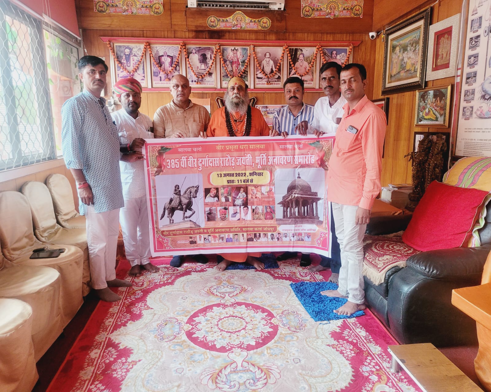 आज गाजियाबाद के प्राचीन सिद्ध पीठ दूधेश्वर नाथ मंदिर में 13 अगस्त हिंदू गौरव मारवाड़ के महानायक राष्ट्रवीर दुर्गादास राठौड़ जी की 385 वी जयंती के अवसर पर मूर्ति अनावरण समारोह 13 अगस्त 2022 सालावा कला जोधपुर राजस्थान में मुख्य अतिथि पावन सानिध्य श्रीमहंत नारायण गिरी जी महाराज अन्तर्राष्ट्रीय प्रवक्ता श्री पंच दशनाम जूना अखाड़ा, परम पूज्य महामंडलेश्वर महेश्वरानंदगिरि जी महाराज ओम आश्रम जाडन पाली ,पूज्य श्रीमहंत प्रताप पुरी जी महाराज तारातरा मठ बाड़मेर, की उपस्थिति रहेगी साथ में ही मुख्य अतिथि केंद्रीय मंत्री रक्षा मंत्री माननीय राजनाथ सिंह जी , अध्यक्षता आदरणीय हिज हाईनेस महाराजाधिराज गज सिंह जी साहब पुर्व नरेश मारवाड़ जोधपुर,अति विशिष्ट अतिथि राष्ट्रीय स्वयंसेवक संघ के क्षेत्र प्रचारक निंबाराम जी, जोधपुर सांसद  केंद्रीय जल शक्ति मंत्री गजेंद्र सिंह शेखावत, पाली सांसद पी पी चौधरी एवं विशिष्ट अतिथि पुखराज जी गर्ग विधायक भोपालगढ़ ,श्रीमती सुरता संगवा प्रधान मंडोर श्रीमती रामेश्वरी चौधरी सरपंच सालवा कला आदि उपस्थित रहेंगे एवं आयोजन के कर्ता-धर्ता  अध्यक्ष डॉ दिलीपकरण मुड़ी, वरिष्ठ उपाध्यक्ष ठा विरेन्द्र करण कीटनोद, उपाध्यक्ष भंवरलाल सालवा, सचिव जुगत सिंह जी करनोत आदि अनेक कार्यक्रम में रहेंगे।
