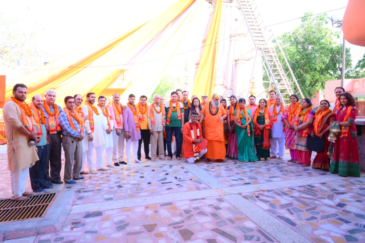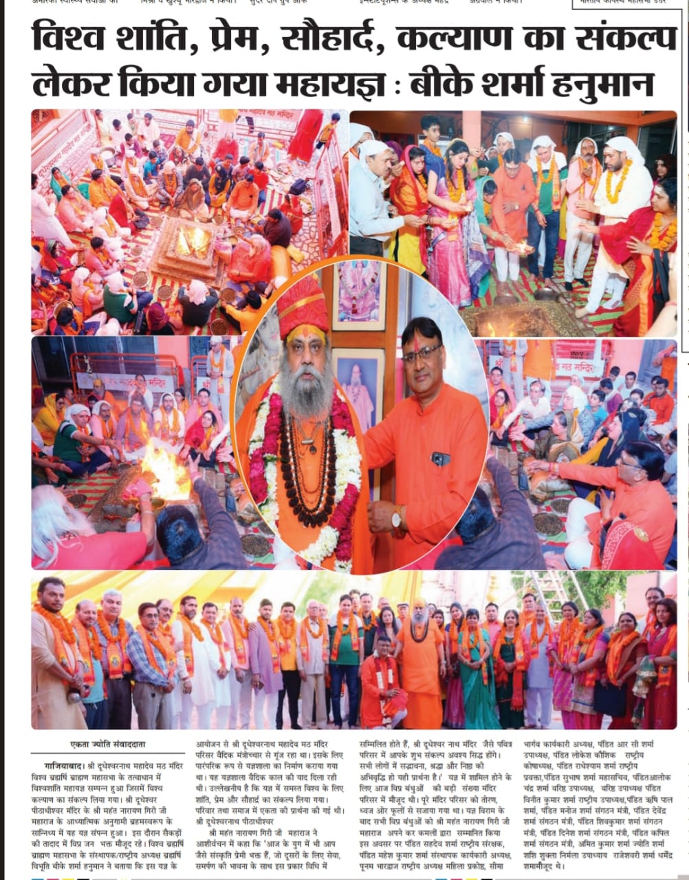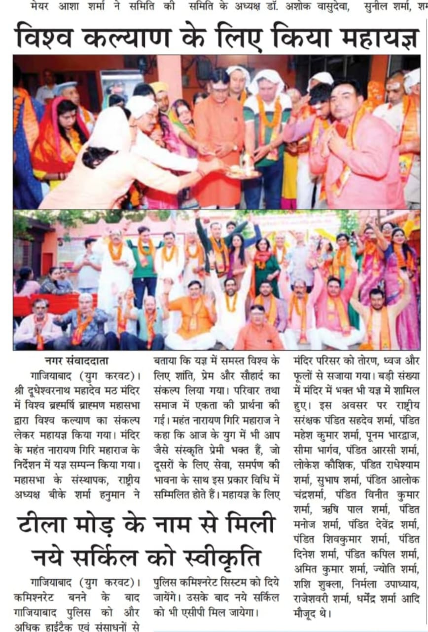 सभी लोगों में सद्भावना, श्रद्धा और निष्ठा की अभिवृद्धि हो यही प्रार्थना है।’ यज्ञ में शामिल होने के लिए आज विप्र बंधुओं की बड़ी संख्या मंदिर परिसर में मौजूद थी। पूरे मंदिर परिसर को तोरण, ध्वज ओर फूलों से सजाया गया था। यज्ञ विराम के बाद सभी विप्र बंधुओं को श्री महंत नारायण गिरी जी महाराज अपने कर कमलों द्वारा सम्मानित किया इस अवसर पर पंडित सहदेव शर्मा राष्ट्रीय संरक्षक, पंडित महेश कुमार शर्मा संस्थापक कार्यकारी अध्यक्ष, पूनम भारद्वाज राष्ट्रीय अध्यक्ष महिला प्रकोष्ठ, सीमा भार्गव कार्यकारी अध्यक्ष, पंडित आर सी शर्मा उपाध्यक्ष, पंडित लोकेश कौशिक राष्ट्रीय कोषाध्यक्ष, पंडित राधेश्याम शर्मा राष्ट्रीय प्रवक्ता,पंडित सुभाष शर्मा महासचिव, पंडितआलोक चंद्र शर्मा वरिष्ठ उपाध्यक्ष, वरिष्ठ उपाध्यक्ष पंडित विनीत कुमार शर्मा राष्ट्रीय उपाध्यक्ष,पंडित ऋषि पाल शर्मा, पंडित मनोज शर्मा संगठन मंत्री, पंडित देवेंद्र शर्मा संगठन मंत्री, पंडित शिवकुमार शर्मा संगठन मंत्री, पंडित दिनेश शर्मा संगठन मंत्री, पंडित कपिल शर्मा संगठन मंत्री, अमित कुमार शर्मा ज्योति शर्मा शशि शुक्ला निर्मला उपाध्याय राजेशवरी शर्मा धर्मेंद्र शर्मा मौजूद थे