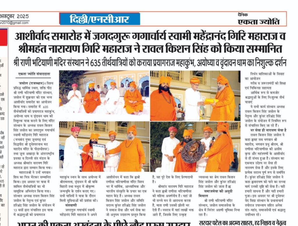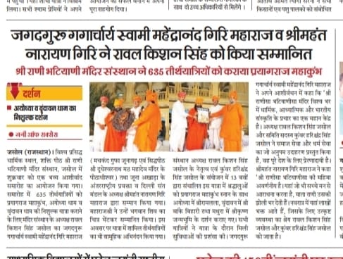 श्री राणी भटियाणी मन्दिर संस्थान के अध्यक्ष रावल किशन सिंह व कुंवर हरिशचंद सिंह ने 650 तीर्थयात्रियों को प्रयागराज महाकुंभ, अयोध्या व वृंदावन धाम की निशुलक यात्रा कराई थी