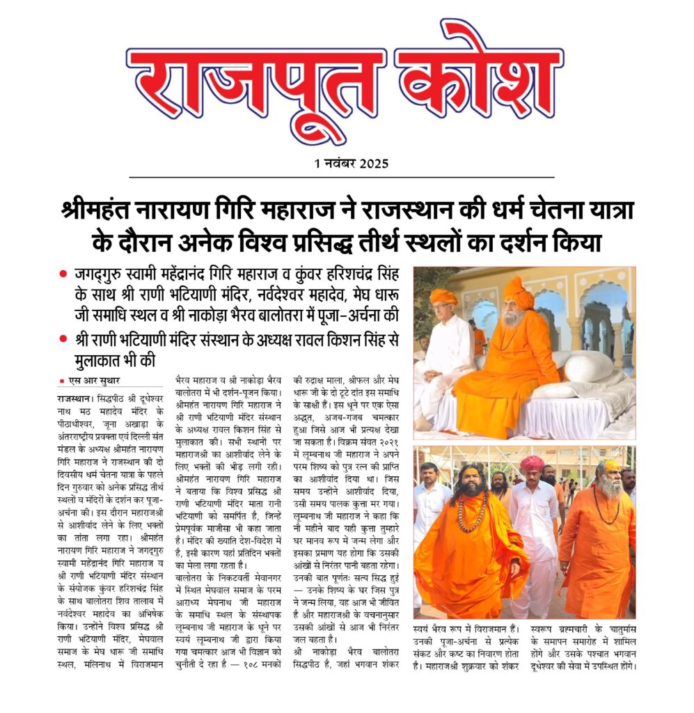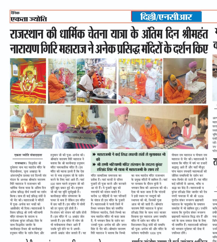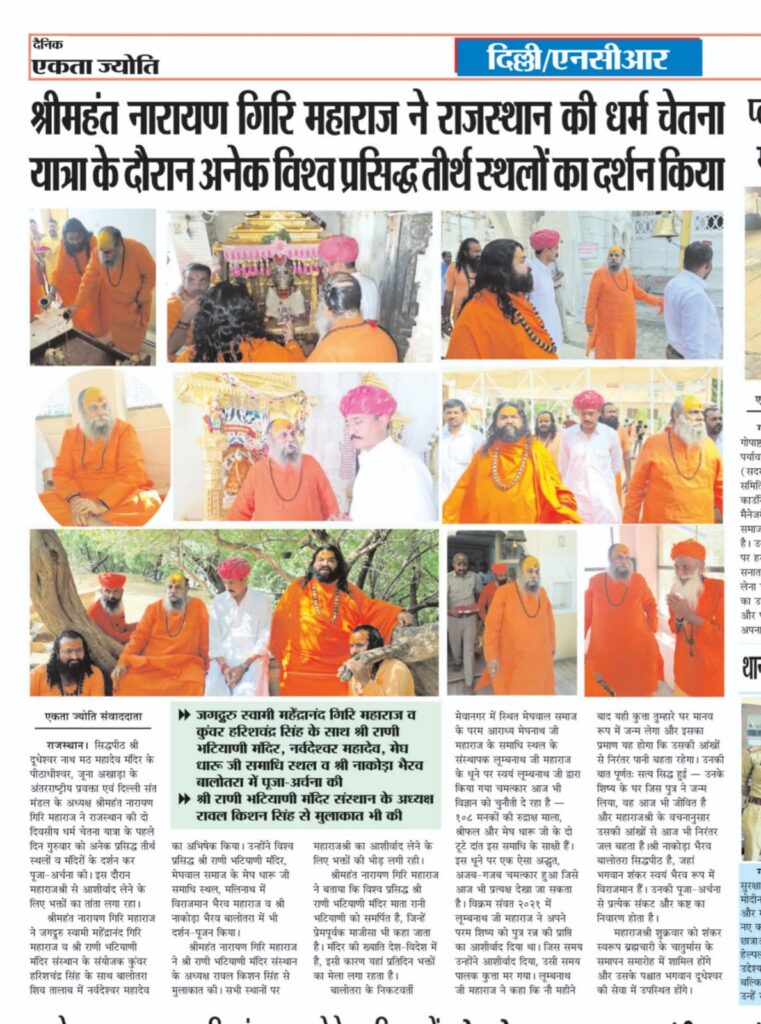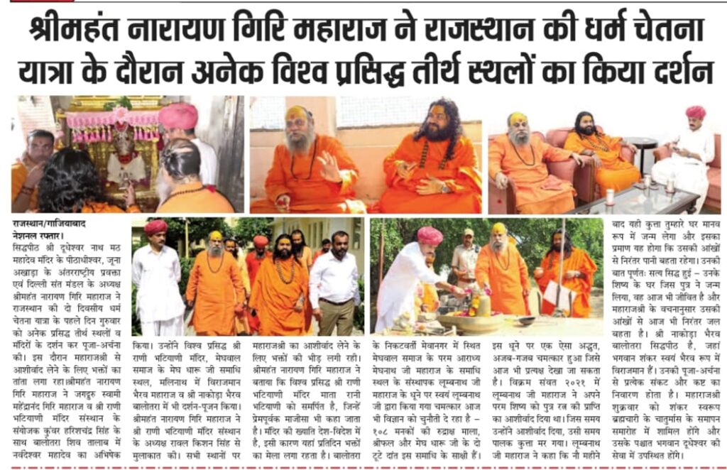सिद्धपीठ श्री दूधेश्वर नाथ मठ महादेव मंदिर के पीठाधीश्वर, जूना अखाड़ा के अंतरराष्ट्रीय प्रवक्ता एवं दिल्ली संत मंडल के अध्यक्ष श्रीमहंत नारायण गिरि महाराज ने राजस्थान की दो दिवसीय धर्म चेतना यात्रा के पहले दिन गुरुवार को अनेक प्रसिद्ध तीर्थ स्थलों व मंदिरों के दर्शन कर पूजा-अर्चना की। इस दौरान महाराजश्री से आशीर्वाद लेने के लिए भक्तों का तांता लगा रहा।
