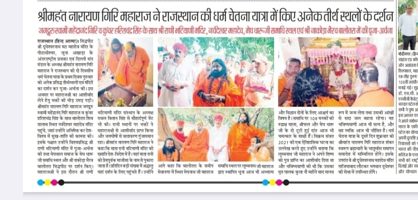 श्रीमहंत नारायण गिरि महाराज ने जगद्गुरु स्वामी महेंद्रानंद गिरि महाराज व श्री राणी भटियाणी मंदिर संस्थान के संयोजक कुंवर हरिशचंद्र सिंह के साथ बालोतरा शिव तालाब में नर्वदेश्वर महादेव का अभिषेक किया। उन्होंने विश्व प्रसिद्ध श्री राणी भटियाणी मंदिर, मेघवाल समाज के मेघ धारू जी समाधि स्थल, मलिनाथ में विराजमान भैरव महाराज व श्री नाकोड़ा भैरव बालोतरा में भी दर्शन-पूजन किया।