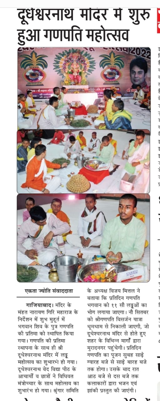 आज सिद्धपीठ श्री दूधेश्वर नाथ महादेव मठ मन्दिर गाजियाबाद उत्तर प्रदेश में प्रतिवर्ष की भांति इस वर्ष भी श्री गणपति लड्डू महोत्सव का भव्य आयोजन किया गया , लड्डू महोत्सव पूज्य गुरुदेव श्रीमहन्त नारायण गिरि जी महाराज श्री दूधेश्वर पीठाधीश्वर गाजियाबाद अन्तर्राष्ट्रीय प्रवक्ता श्रीपंचदशनाम जूना अखाड़ा के अध्यक्षता व सानिध्य में आज प्रथम दिवस गणेश चतुर्थी को भगवान श्री गणेश को स्थापित करके प्राणप्रतिष्ठा हुई, षोडशोपचार पूजन हुआ 1008 भगवान श्री गणेशा का मोदक से अर्चना किया गया , गणपति लड्डू महोत्सव 9 सितम्बर अनन्त चतुर्दशी तक चलने वाला है प्रत्येक दिवस भगवान श्री गणेश का पूजन अभिषेक सहस्रनाम अर्चना होगा तदोपरान्त रात्री काल आरती के पश्चात लड्डू का प्रसाद वितरण किया जायेगा साथ ही प्रख्यात कलाकारों द्वारा सांस्कृतिक कार्यक्रम रात्री 8 से 10 बजे तक प्रस्तुत किया जायेगा दूधेश्वर गणपति लड्डू महोत्सव 10दिन तक बहुत भव्य रूप से धूम धाम से मानाया जायेगा लड्डू महोत्सव में विशेष सहयोग मन्दिर विकास समिति के अध्यक्ष धर्मपाल गर्ग जी , उपाध्यक्ष अनुज गर्ग जी के पूरृण सहयोग से कार्यक्रम बहुत दिव्य एवं भव्य आज से प्रारम्भ हुआ ,