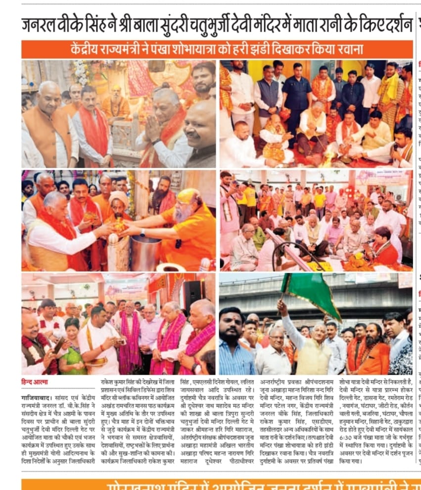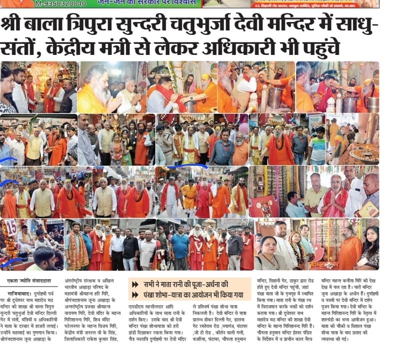जिसमें कि सभी कार्यक्रम पूज्य गुरुदेव श्रीमहन्त नारायण गिरि जी महाराज श्री दूधेश्वर पीठाधीश्वर गाजियाबाद अन्तर्राष्ट्रीय प्रवक्ता श्रीपंचदशनाम जूना अखाड़ा के पावन सानिध्य दिशानिर्देश अध्यक्षता में सम्पन्न हुआ ,कल रात्री हवन में डा संजय गर्ग जी सपिरवार ,वकील शैलेन्द्र कुमार शर्मा जी सपिरवार,राबिन गोस्वामी जी,रतन गोस्वामी जी सपिरवार उपस्थित होकर हवन में भाग लिया , पूज्य गुरुदेव के सानिध्य में प्रधान आचार्य डा कैलाश नाथ तिवारी जी ,दूधेश्वर वेद विद्यालय के वरिष्ठ प्राचार्य लक्ष्मीकान्त पाढी जी, प्राचार्य तोयराज उपाध्याय जी , आचार्य नित्यानंद जी , आचार्य रोहित जी ,एवं अन्य आचार्यों के साथ हवन यज्ञ पूर्णाहुति सम्पन्न हुआ ,आज प्रातः काल स्थापित समस्त वेदियो का पूजन करके विदाई दिया ,12 बजे पूज्य गुरुदेव ने कन्या पूजन किया तदोपरान्त भक्तों के लिये भण्डारा प्रसाद प्रारंभ हुआ जिसमें सैकडो भक्तों ने प्रसाद ग्रहण किया ,श्री दूधेश्वर चैत्र नवरात्रि महोत्सव समस्त भक्तो के सहयोग से सम्पन्न हुआ ।