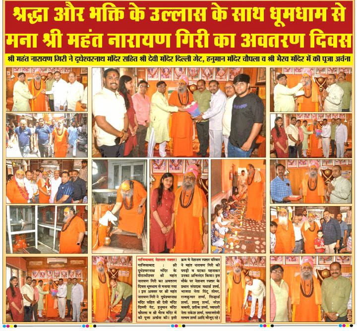 आज श्रीमहन्त नारायण गिरि जी महाराज सिद्धपीठ श्री दूधेश्वर नाथ महादेव मठ मन्दिर गाजियाबाद अन्तर्राष्ट्रीय प्रवक्ता श्रीपंचदशनाम जूना अखाड़ा के प्राकट्य दिवस के अवसर पर आज प्रातः काल पूज्य गुरुदेव ने भगवान दूधेश्वर का अभिषेक पूजन किया , ब्रह्मलीन सिद्ध समाधी वाले गुरूमुर्तियो का पूजन करके मत्था टेका कर आशीर्वाद प्राप्त किया , मन्दिर में स्थापित समस्त देवी देवताओं का पूजन दर्शन किया , गौशाला में जाकर गौ माता को गौ ग्रास खिलाया तदोपरान्त श्री दूधेश्वर वेद विद्यालय के आचार्यों का पूजन किया ,