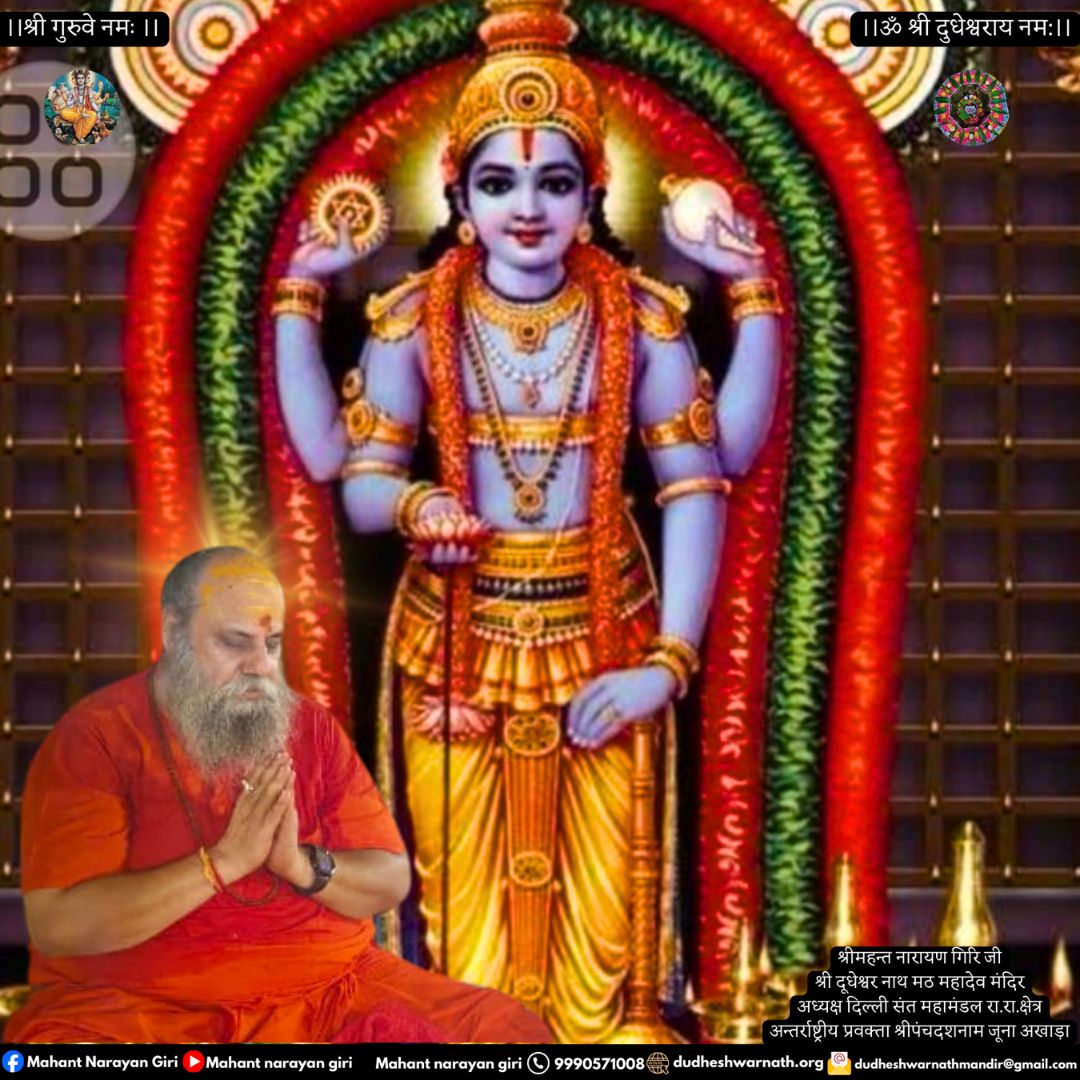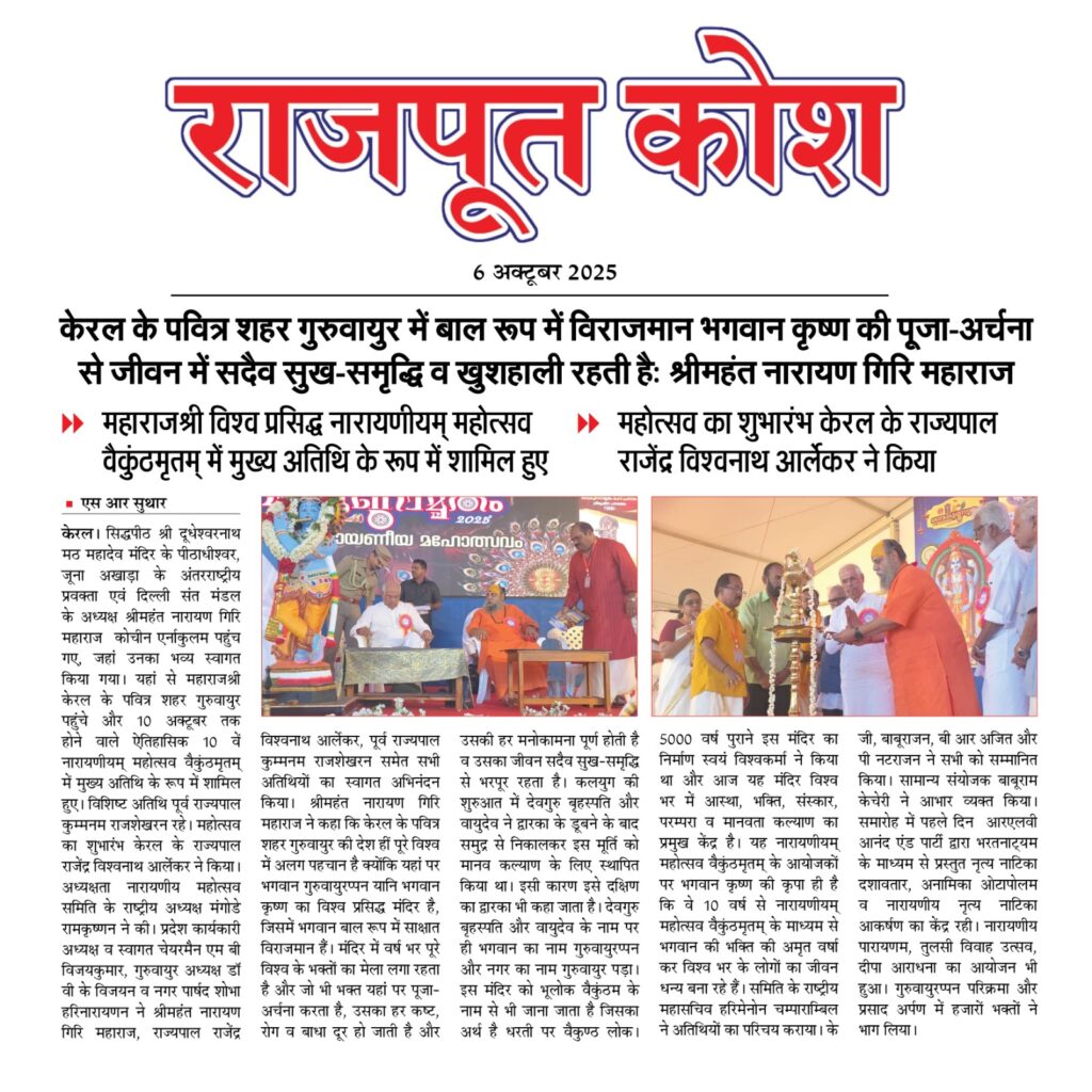 सिद्धपीठ श्री दूधेश्वरनाथ मठ महादेव मंदिर के पीठाधीश्वर, जूना अखाड़ा के अंतरराष्ट्रीय प्रवक्ता एवं दिल्ली संत मंडल के अध्यक्ष श्रीमहंत नारायण गिरि महाराज ने केरल के पवित्र शहर गुरुवायूर में विश्व प्रसिद्ध गुरुवायूर मंदिर के दर्शन किए। उन्होंने मंदिर में बाल रूप से विराजमान साक्षात भगवान कृष्ण की पूजा-अर्चना की और सभी की सुख-समृद्धि व विश्व कल्याण की कामना से दीप जलाए। मंदिर में एक लाख दीप जलाए गए। महाराजश्री 5 अक्टूबर से शुरू हुए ऐतिहासिक 10वें नारायणीयम् महोत्सव वैकुंठमृतम् में मुख्य अतिथि के रूप में शामिल होने के लिए केरल पहुंचे हैं। समारोह 10 अक्टूबर तक चलेगा।