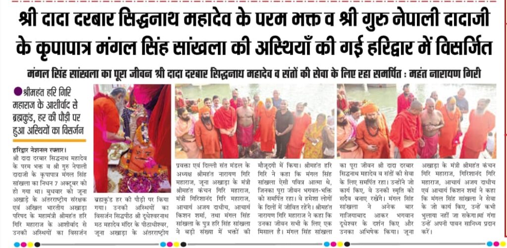 श्री दादा दरबार सिद्धनाथ महादेव के परम भक्त व श्री गुरु नेपाली दादाजी के कृपापात्र मंगल सिंह सांखला का निधन 7 अक्टूबर को हो गया था। बुधवार को जूना अखाड़े के अंतरराष्ट्रीय संरक्षक एवं अखिल भारतीय अखाड़ा परिषद के महामंत्री श्रीमहंत हरि गिरि महाराज के आशीर्वाद से उनकी अस्थियों का विसर्जन ब्रह्मकुंड हर की पौड़ी पर किया गया।